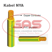 Kabel Penyalur Petir dengan single core dan single isolasi pvc. baik digunakan untuk pemasangan didalam bangunan dan juga jauh dari instalasi lain (listrik, data) serta penghuni bangunan dengan penampang minimal 50 mm.