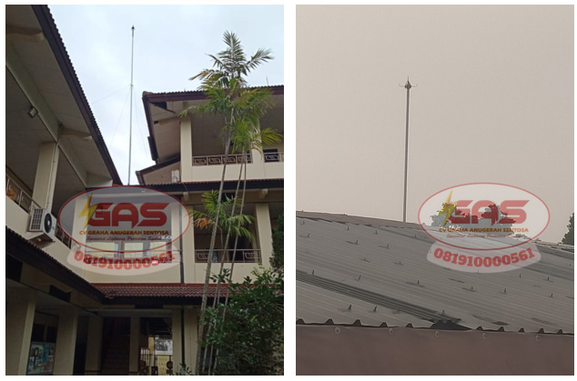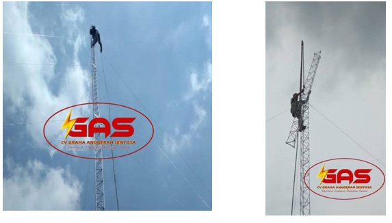 Instalasi penangkal petir dengan konstruksi seperti ini mirip dengan di atas tower threeangle, bedanya hanya pada struktur tower yang lebih besar, sementara cara mendirikan tiang penyangga penangkal petirnya sama